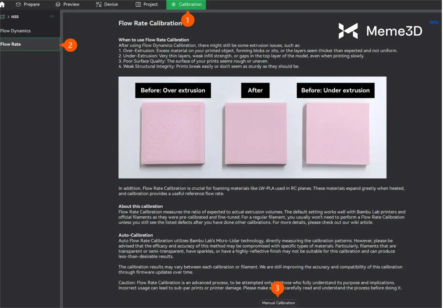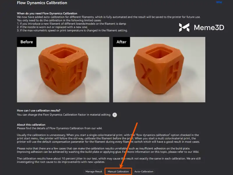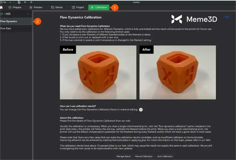 Việc hiệu chuẩn tốc độ dòng chảy được thực hiện sau khi đã thực hiện phân tích động lực dòng chảy, tấm in đã được làm sạch và lắp lại vào máy in. Để bắt đầu, chỉ cần điều hướng đến tab Hiệu chuẩn > Tốc độ dòng chảy , sau đó nhấp vào Hiệu chuẩn thủ công.