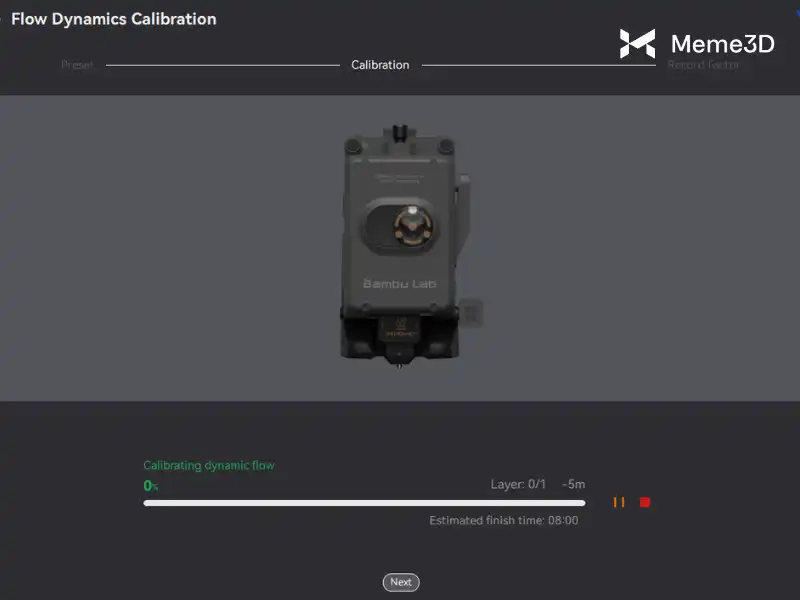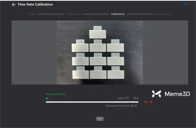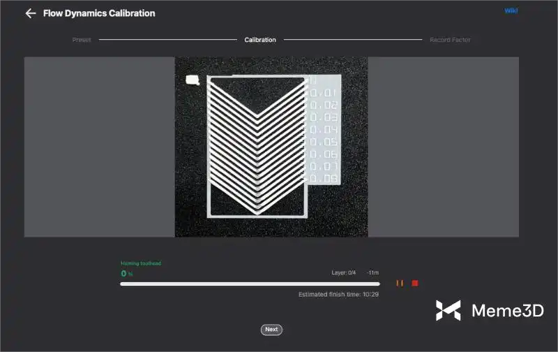 Sau khi bạn nhấp vào nút Hiệu chỉnh , máy in sẽ bắt đầu tự động hiệu chỉnh sợi nhựa, đưa sợi nhựa qua vòi phun với tốc độ khác nhau và đo áp suất vòi phun một cách cẩn thận. Bạn chỉ cần đợi máy in hoàn thành công việc, sau đó chuyển sang bước tiếp theo.