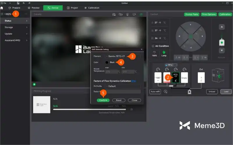Để hiệu chỉnh Flow Dynamics, hãy mở Bambu Studio và đảm bảo rằng sợi nhựa được cấu hình chính xác trong phần cài đặt. Trong ví dụ này, chúng ta sẽ sử dụng Bambu Lab PETG CF. Vào tab Thiết bị, chọn loại và màu sắc của sợi nhựa, sau đó xác nhận.