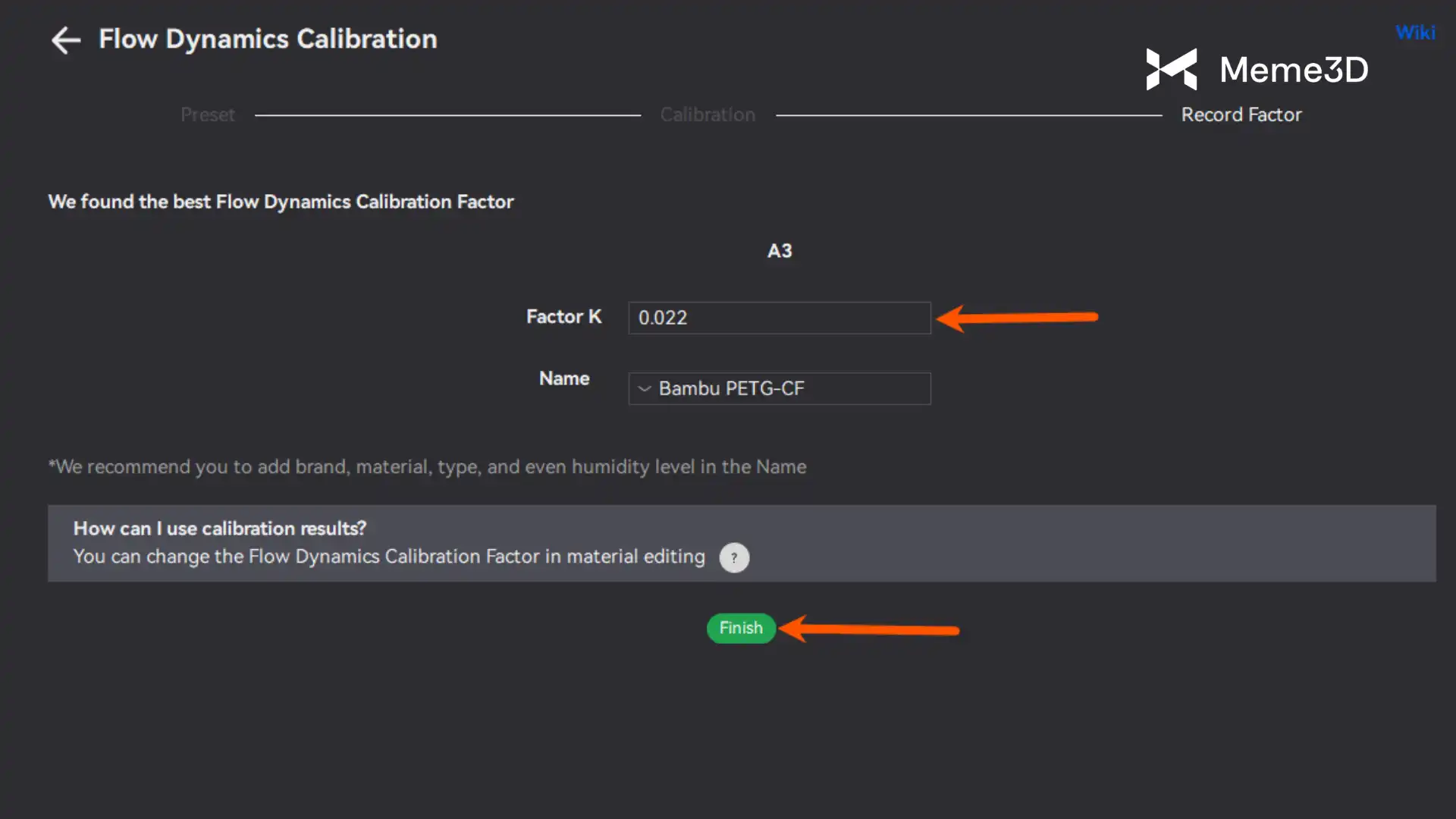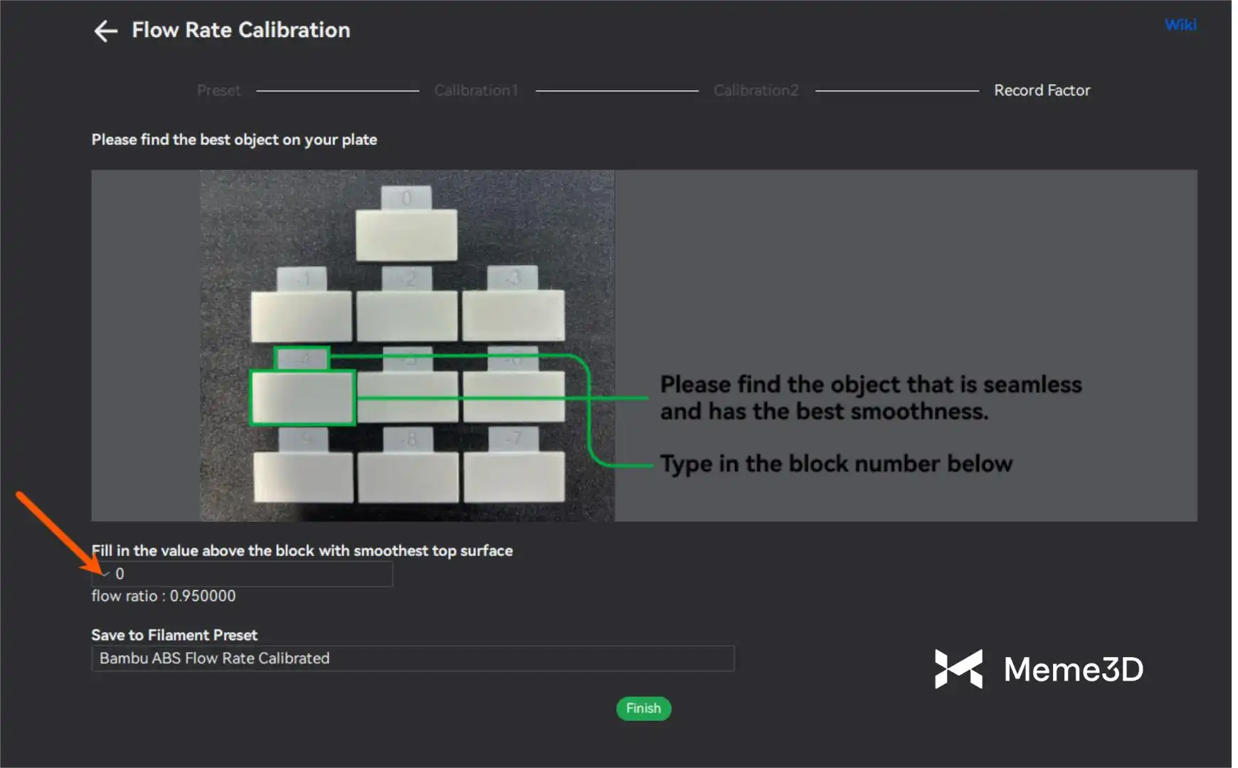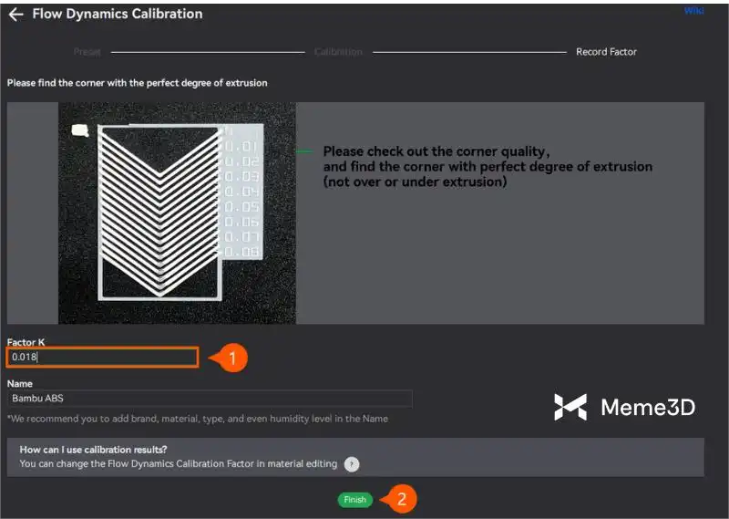 Tiếp theo, chọn mẫu có độ mịn cao nhất, trong trường hợp này là số 0, rồi đặt tên cho thiết lập sẵn của sợi filament. Quá trình hiệu chuẩn được hoàn tất bằng cách nhấp vào nút Finish.