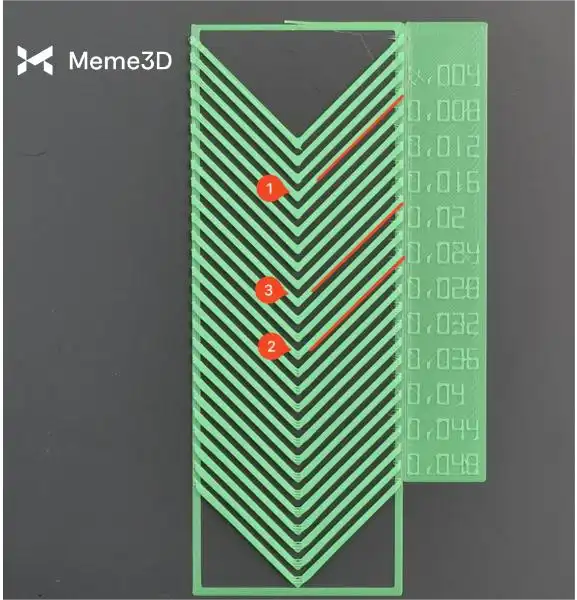 Việc này có thể khó khăn hơn một chút, vì một số mẫu thử sẽ có sự khác biệt rất nhỏ. Hãy thử quan sát chúng với ánh sáng chiếu từ phía bên trái và đặt các mẫu tương tự như hình bên dưới. Chú ý kỹ phần giữa của các hình chữ nhật mẫu thử, vì đó sẽ là nơi thể hiện bất kỳ dấu hiệu nào của việc đùn thiếu vật liệu. Phần đầu và cuối của các đường in có thể cho thấy dấu hiệu đùn thừa vật liệu nhẹ, nhưng điều đó được coi là bình thường.