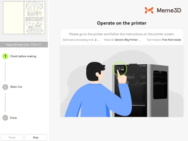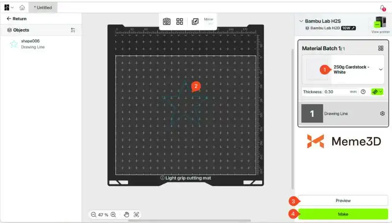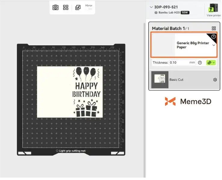 Trong bảng điều khiển Quản lý vật liệu , chọn vật liệu bạn đang sử dụng, ví dụ: Giấy bìa 250g – Trắng . Kiểm tra xem thiết kế đã được căn chỉnh chính xác trên bản xem trước của thảm cắt chưa. Khi mọi thứ đã ổn, hãy nhấp vào Tạo để gửi lệnh đến máy in. Máy sẽ hướng dẫn bạn hoàn tất các bước còn lại của quá trình vẽ.