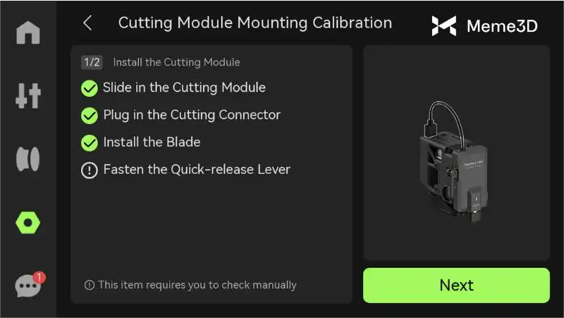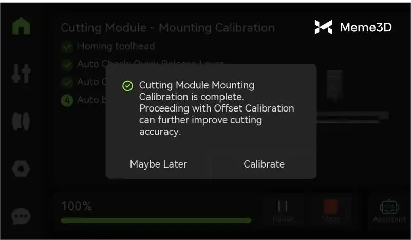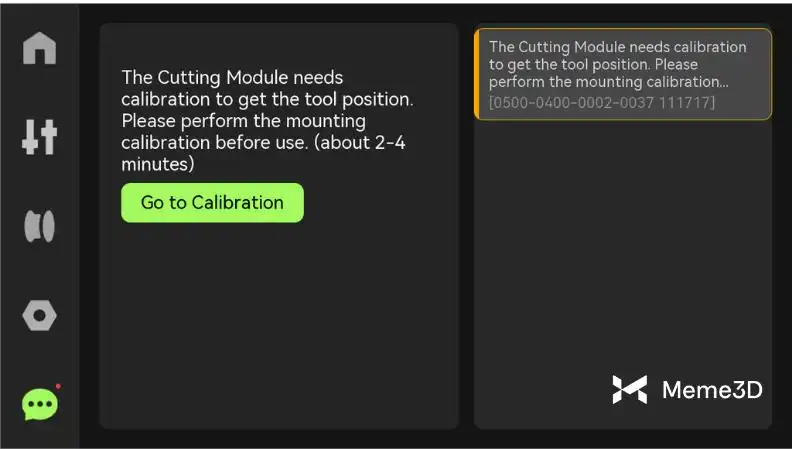 Nhấp vào ” Đi đến hiệu chuẩn” để bắt đầu quá trình hiệu chuẩn. Hoặc, trên màn hình cảm ứng, hãy vào “Cài đặt” > “Hộp công cụ” > “Hiệu chuẩn lắp đặt mô-đun cắt” > “Tiếp theo” > “Bắt đầu” và bắt đầu quá trình hiệu chuẩn.