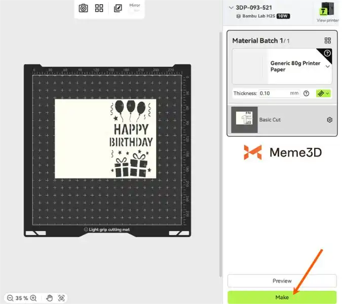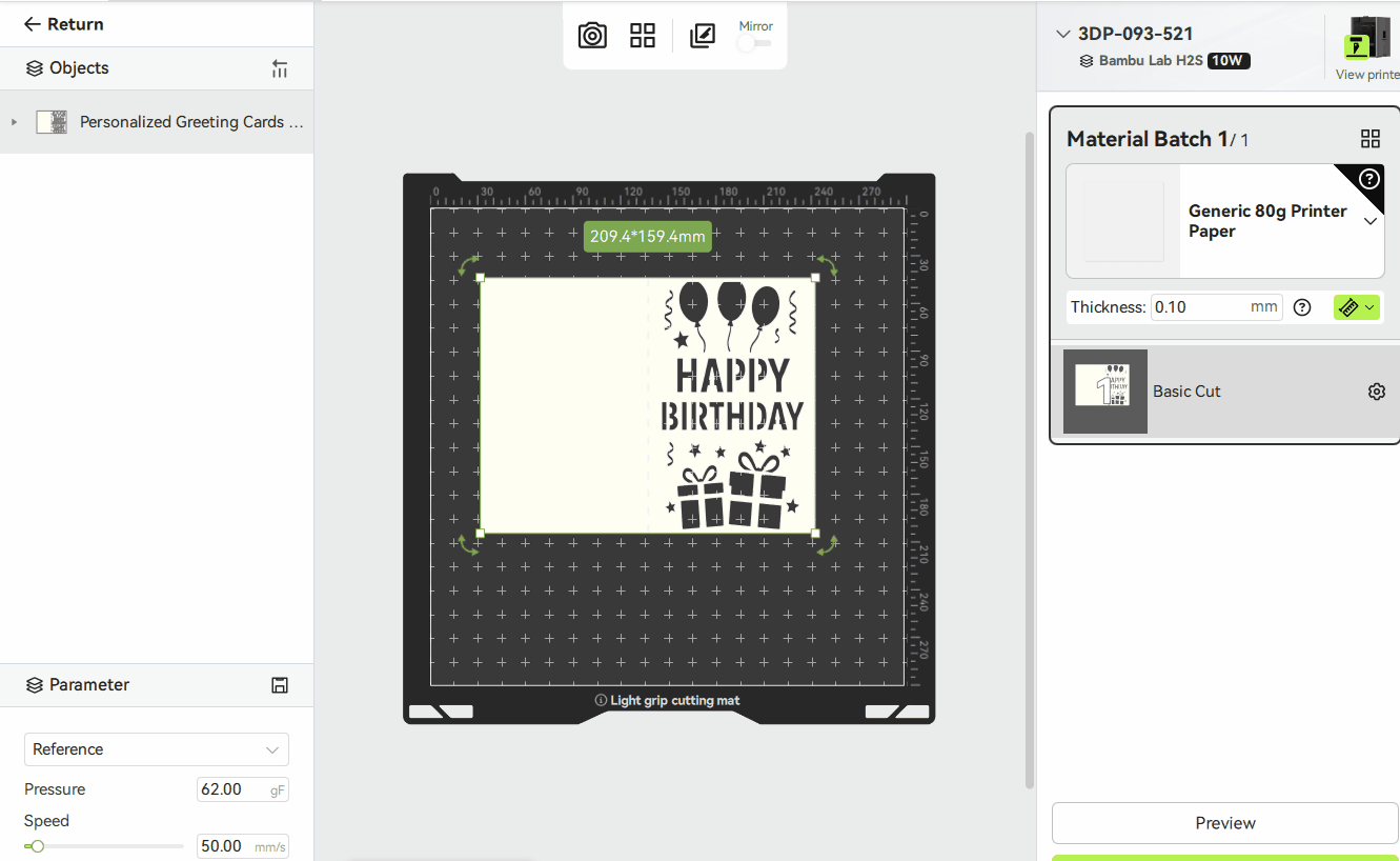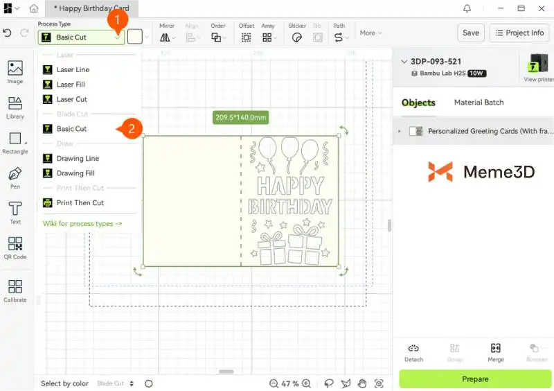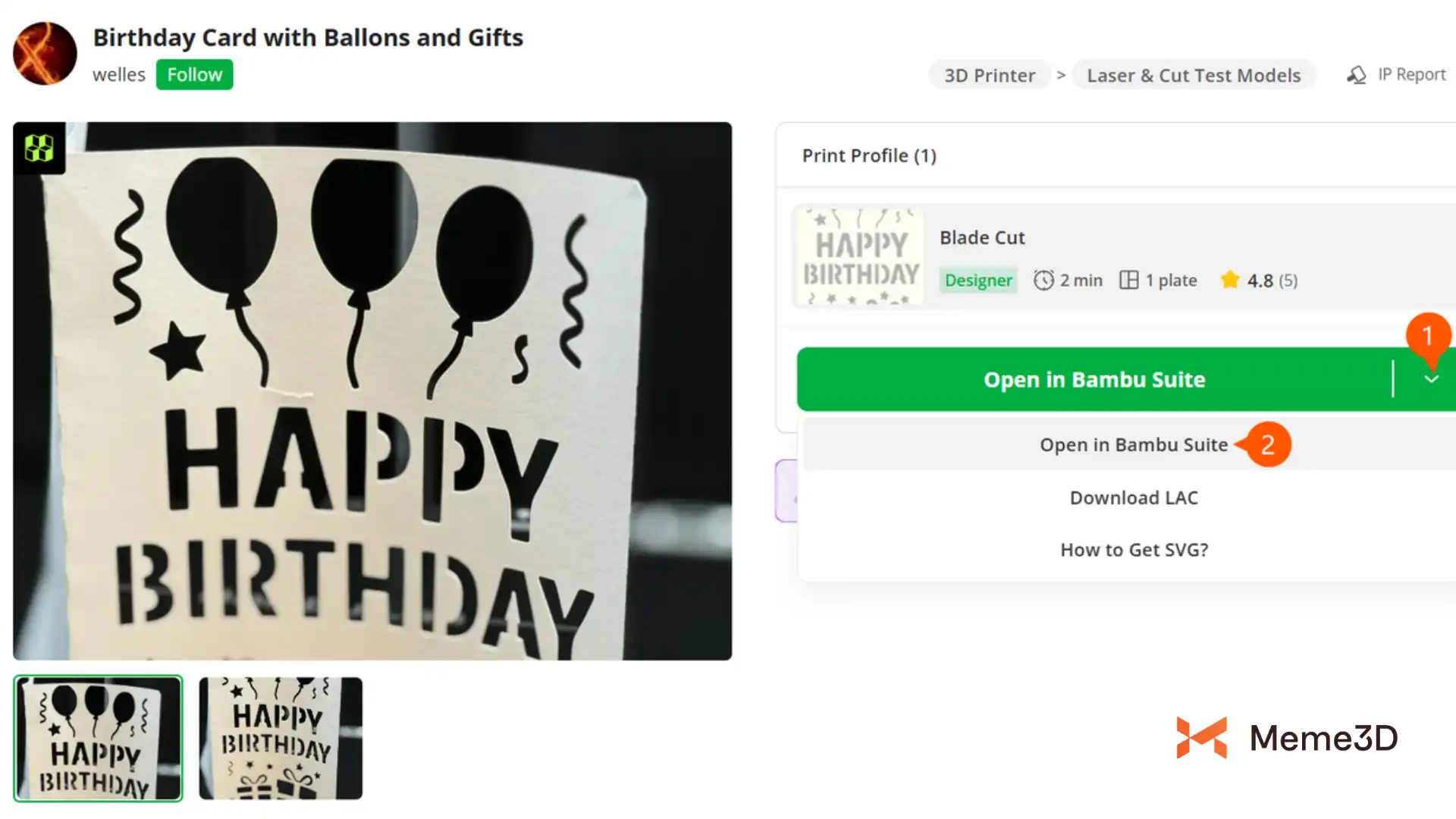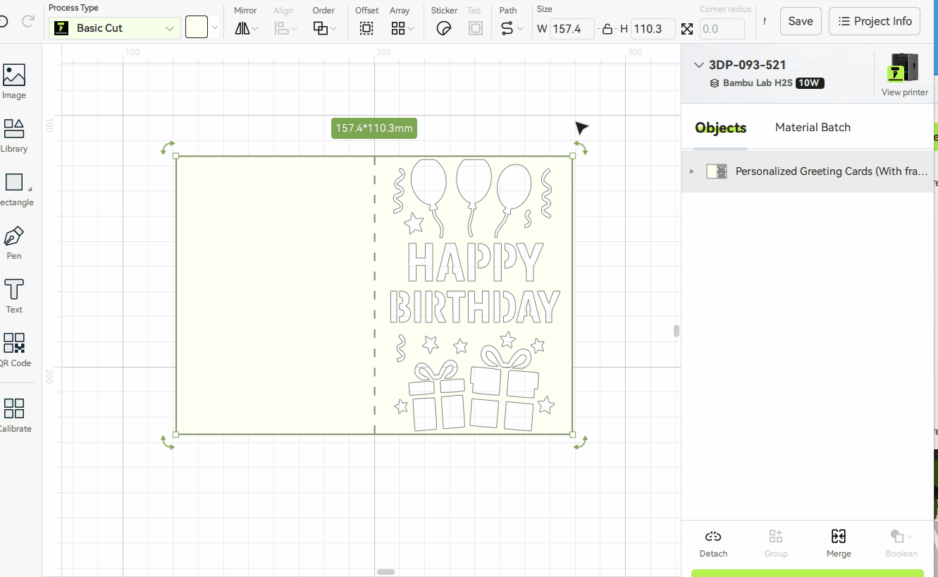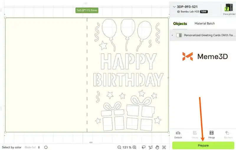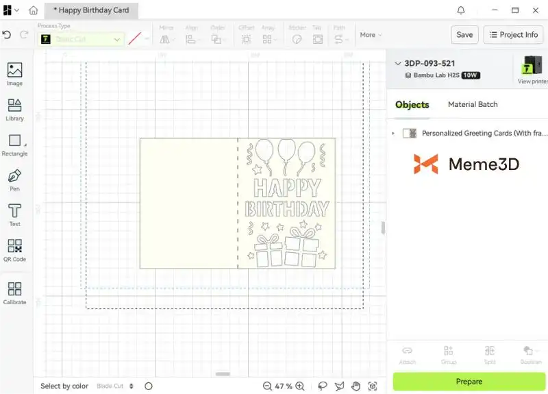 Để bắt đầu một dự án cắt, chúng ta cần sử dụng phần mềm Bambu Suite để chuẩn bị tệp. Chúng ta sẽ sử dụng mẫu Thiệp sinh nhật với bóng bay và quà tặng của Welles để minh họa. Bạn có thể mua mẫu này từ Makerworld .