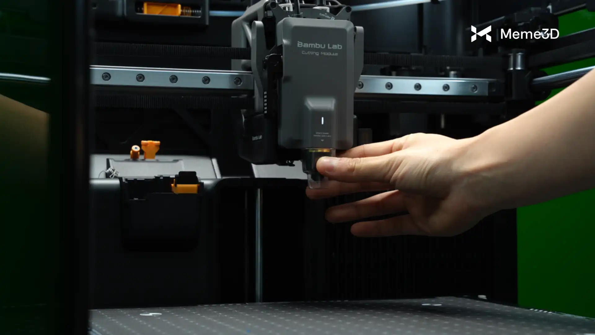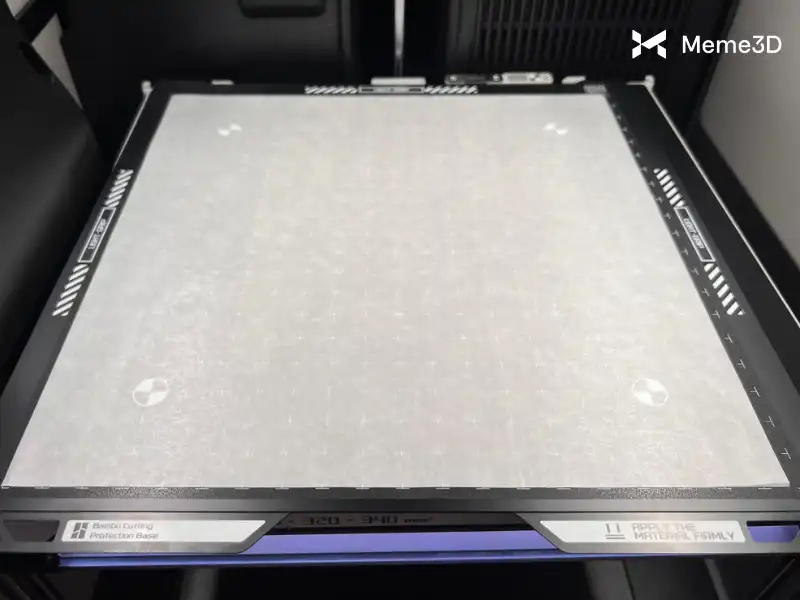 Để chuẩn bị, trước tiên hãy tháo tấm đế in ra khỏi bàn nhiệt. Nếu bàn nhiệt được đặt quá cao, hãy hạ thấp nó xuống bằng các nút điều khiển trên màn hình cảm ứng. Điều này giúp ngăn mô-đun cắt tiếp xúc với tấm in.
