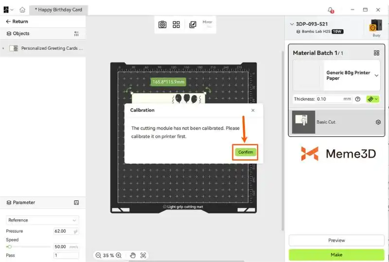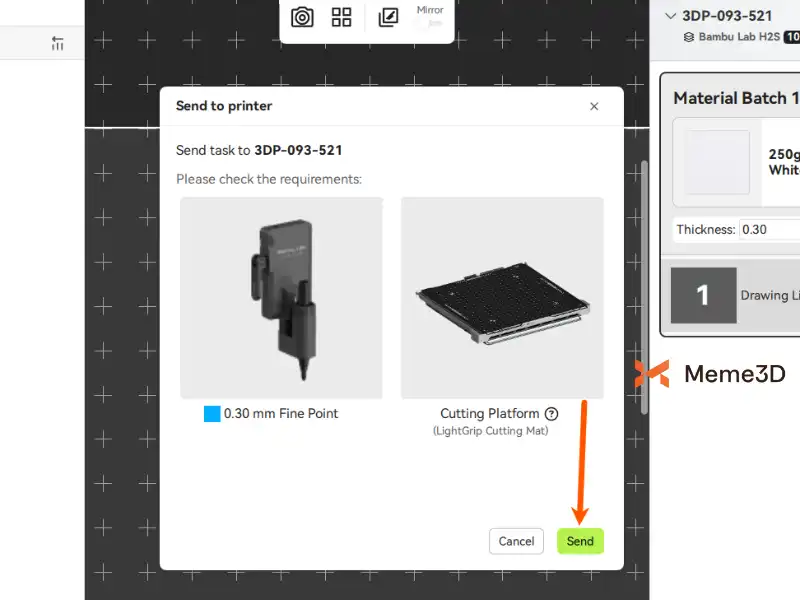 Xác nhận và bắt đầu vẽ . Sau khi nhấp vào “Tạo” , một cửa sổ xác nhận sẽ hiện ra, hiển thị các thiết lập cần thiết, ví dụ như bút đầu nhọn 0.30 mm và thảm cắt LightGrip . Hãy kiểm tra kỹ xem chúng có khớp với những gì bạn đã cài đặt trên máy in của mình hay không. Sau khi xác nhận, nhấp vào “Gửi” để bắt đầu công việc vẽ.