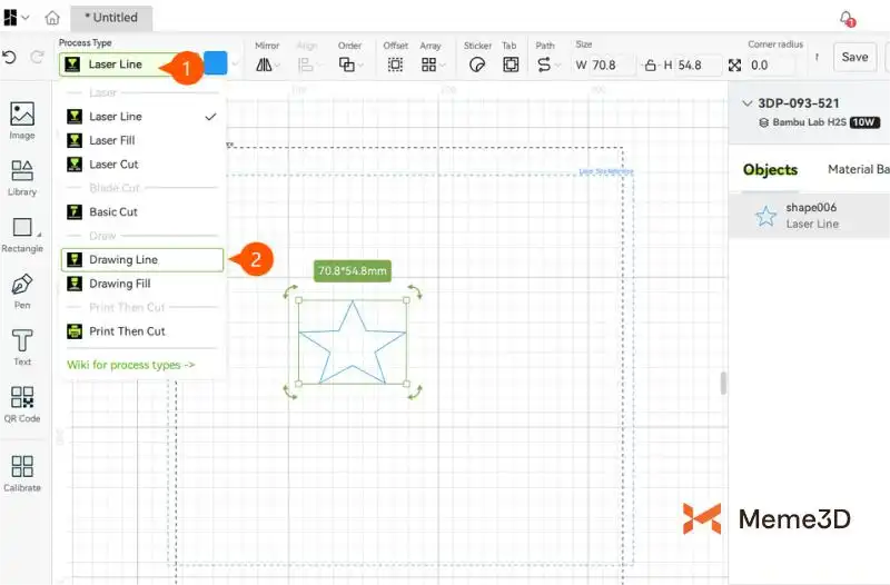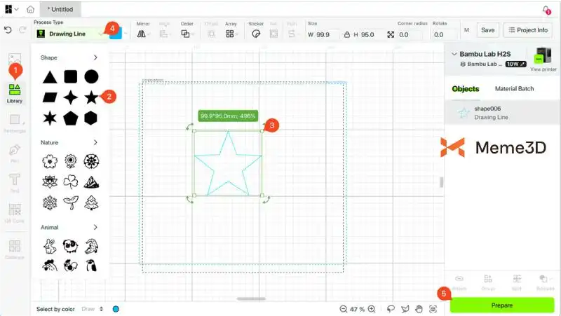 Mở bảng Thư viện và chọn một hình dạng, chẳng hạn như hình ngôi sao. Thay đổi kích thước hoặc điều chỉnh hình dạng trên khung vẽ bằng cách kéo các góc cho đến khi nó phù hợp với dự án của bạn. Đặt Loại quy trình thành Vẽ đường thẳng.