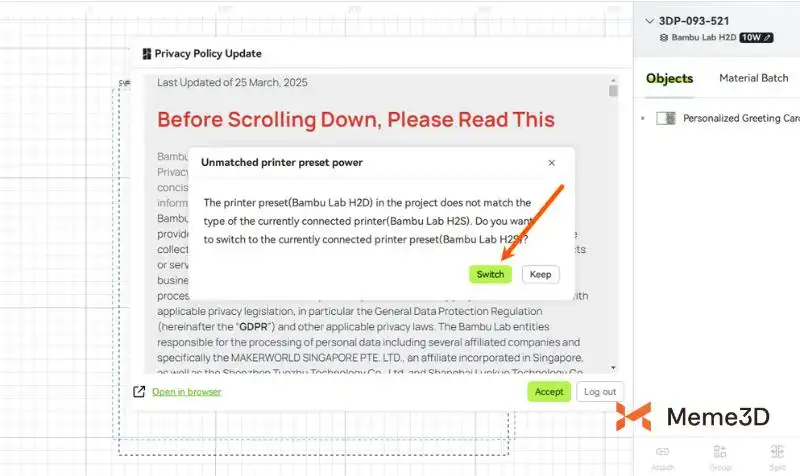 Chấp nhận bản cập nhật chính sách bảo mật và dự án sẽ được nhập vào Bambu Suite.