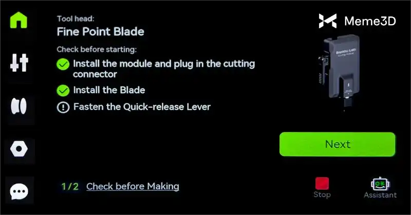 Hãy làm theo hướng dẫn trên màn hình. Nếu bạn đã lắp đặt lưỡi dao, mô-đun và đầu nối mô-đun cắt đúng cách, hãy nhấp vào Tiếp theo.