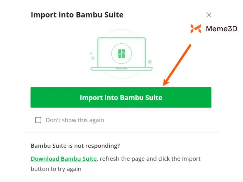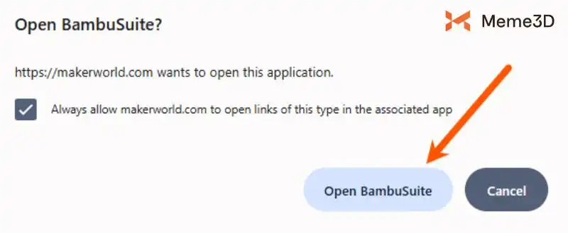 Bạn sẽ thấy một thông báo yêu cầu bạn Mở Bambu Suite. Nhấp vào Mở Bambu Suite. Nếu trước đó bạn đã nhập dự án thông qua MakerWorld, bạn sẽ không thấy thông báo này.
