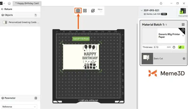Trong giao diện chuẩn bị, hãy nhấp vào nút “Máy ảnh” trên thanh công cụ phía dưới để chụp vị trí hiện tại của vật liệu trên bàn làm việc. Tìm hiểu thêm về Máy ảnh trong wiki chụp ảnh của Bambu Suite.