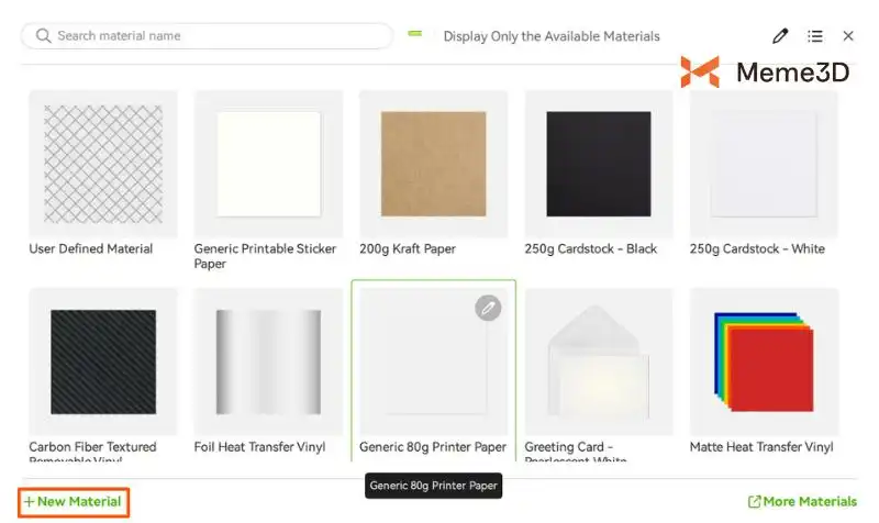 Trong phần “Material Batch” , bạn sẽ thấy loại vật liệu được phần mềm nhận diện. Trong trường hợp của chúng tôi, đó là giấy in thông thường 80g mà chúng tôi đã đặt lên thảm cắt khi thực hiện hiệu chỉnh Offset.