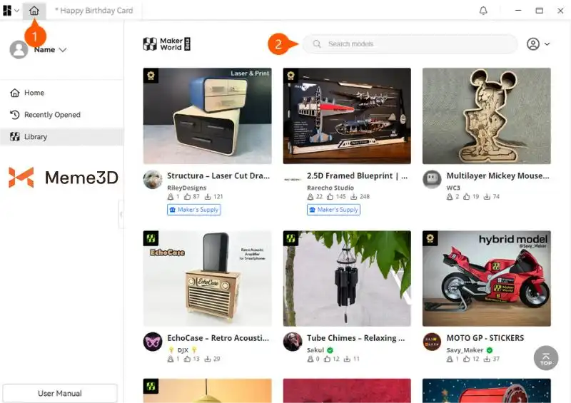 Bạn cũng có thể duyệt và tìm kiếm các dự án trong MakerWorld khi đang sử dụng Bambu Suite bằng cách nhấp vào biểu tượng trang chủ, sau đó nhập tên vào thanh tìm kiếm.