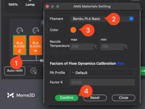 Ngoài ra, cuộn dây dự phòng phải được nạp trước khi bắt đầu in, vì hệ thống AMS không cho phép cấu hình hoặc nạp dây dự phòng trong khi công việc in đang diễn ra. Nếu không tìm thấy sợi nhựa phù hợp, hệ thống AMS sẽ tạm dừng quá trình in và nhắc bạn thay thế cuộn dây đã hết, tránh các lỗi tiềm ẩn.