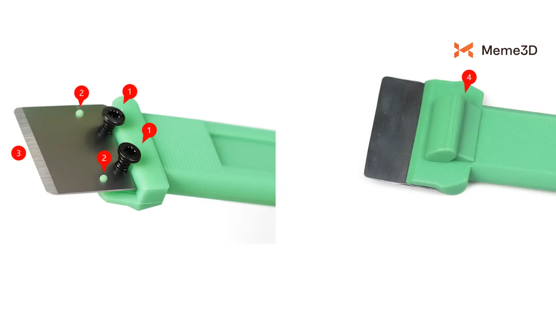 Vặn hai vít tự ren M2.6×6 vào bộ phận in (1), sau đó lắp lưỡi gạt vào cụm, đảm bảo các lỗ định vị nằm đúng vị trí (2) và cạnh lưỡi hướng về phía vít (3). Đặt giá đỡ ngón tay cái vào mặt sau của cụm như hình minh họa (4), và siết chặt hoàn toàn các vít giữ mọi thứ lại với nhau.
