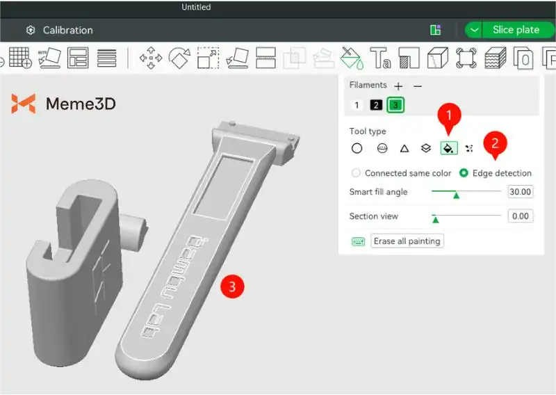 Các công cụ vẽ bạn sử dụng sẽ phụ thuộc vào hình dạng và chi tiết của mô hình. Để tô màu nhanh và chính xác, công cụ Tô màu (1) là một lựa chọn tuyệt vời. Chỉ với một cú nhấp chuột, công cụ Tô màu cho phép bạn tô màu toàn bộ các phần của mô hình. Chọn “Phát hiện cạnh” (2) để tô màu một khu vực chính xác (3).