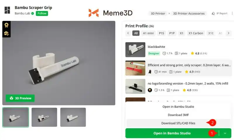 Mở mô hình dụng cụ cạo trong Bambu Studio bằng cách điều hướng đến mô hình tay cầm dụng cụ cạo Bambu trong Markerworld , sau đó cuộn xuống nút màu xanh lá cây “Mở trong Bambu Studio” và nhấp vào mũi tên nhỏ bên phải (1).