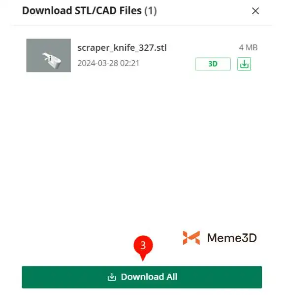 Một cửa sổ bật lên sẽ xuất hiện, hãy nhấp vào “Tải xuống tệp STL/CAD” (2).