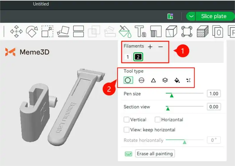 Trong tab Sợi, bạn có thể xem các màu sợi có sẵn cho AMS 2 PRO (1). Sau đó, chọn một công cụ tô màu (2) để bắt đầu tô màu cho các phần khác nhau của mô hình.