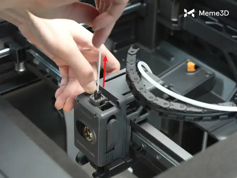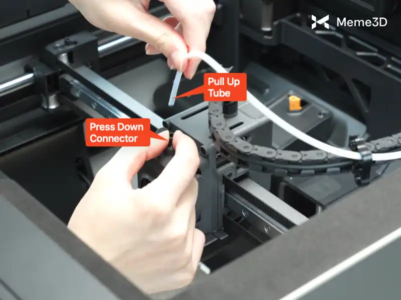 3. Tiến hành tháo ống PTFE Khi được nhắc, hãy ngắt kết nối ống PTFE khỏi đầu dụng cụ. Để làm điều này, hãy nhấn xuống đầu nối và đồng thời kéo ống PTFE lên cho đến khi nó được tháo rời.