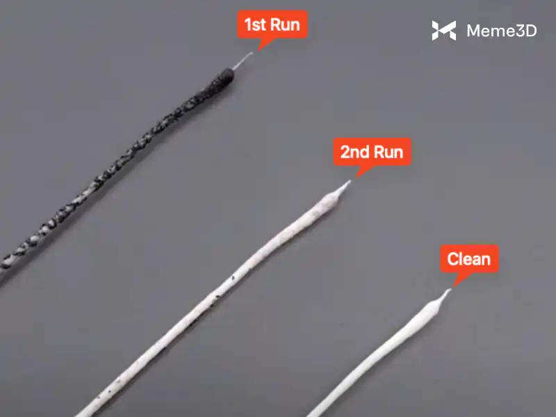 Sợi nhựa hoạt động như một “nút bịt” liên kết với cặn bẩn bên trong vòi phun trong giai đoạn làm nguội. Việc rút sợi nhựa ra sẽ giúp loại bỏ các chất bẩn, chẳng hạn như sợi nhựa bị cháy, bụi bẩn hoặc các vật cản nhỏ.