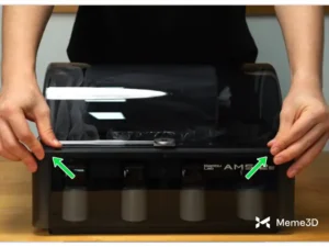 - Mở nắp AMS và đặt cuộn nhựa in vào khe trống. Nắp có các chốt khóa xoay để giữ chặt nắp. Xoay các chốt ra ngoài để mở khóa nắp, và xoay vào trong để khóa chặt sau khi đã đặt cuộn dây vào.