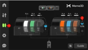 Tiếp theo, trên màn hình cảm ứng của máy in, điều hướng đến phần Sợi in (Filament ). Màn hình này sẽ hiển thị sơ đồ với từng bộ phận AMS được kết nối với H2S. Nhấp vào biểu tượng độ ẩm AMS cho bộ phận AMS đang được sử dụng để sấy khô. Thao tác này sẽ mở trang Sấy khô và Độ ẩm (Drying and Humidity).