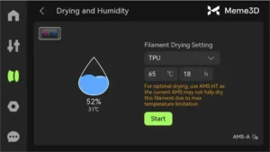 Máy sấy AMS 2 Pro có khả năng đạt nhiệt độ sấy tối đa 65 °C, đủ để sấy khô hiệu quả hầu hết các loại sợi in 3D. Tuy nhiên, một số loại sợi có thể cần nhiệt độ cao hơn 65 °C. Trong trường hợp này, bạn sẽ thấy thông báo đề nghị sử dụng máy sấy AMS HT (có thể đạt đến 85 °C).