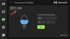 Bạn có thể theo dõi độ ẩm và nhiệt độ theo thời gian thực bằng cách nhấp vào góc trên bên trái. Nếu bạn đã kết nối nhiều thiết bị AMS, bạn cũng có thể sử dụng tùy chọn đó để chuyển đổi giữa các thiết bị AMS. Bạn sẽ có thể xem độ ẩm, nhiệt độ và thời gian còn lại.
