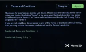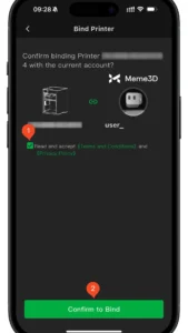 Sau khi quét xong, màn hình này sẽ hiển thị trong Bambu Handy, nơi bạn có thể xác nhận quá trình liên kết. Đọc và chấp nhận các điều khoản và điều kiện, sau đó nhấn Xác nhận để liên kết.