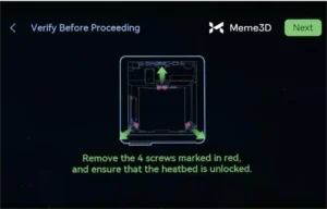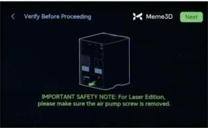 Tiếp theo, một lời nhắc nhở sẽ hiển thị trên màn hình liên quan đến phiên bản máy in H2S Laser Edition. Nếu bạn đã mua phiên bản này, hãy đảm bảo rằng bạn đã tháo vít bơm ở phía sau máy in. Bước này cũng được hướng dẫn trong Hướng dẫn Khởi động Nhanh.