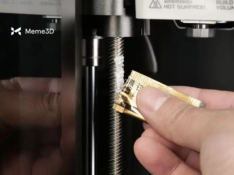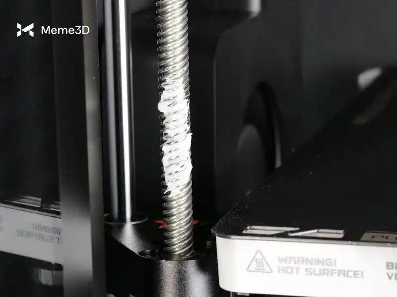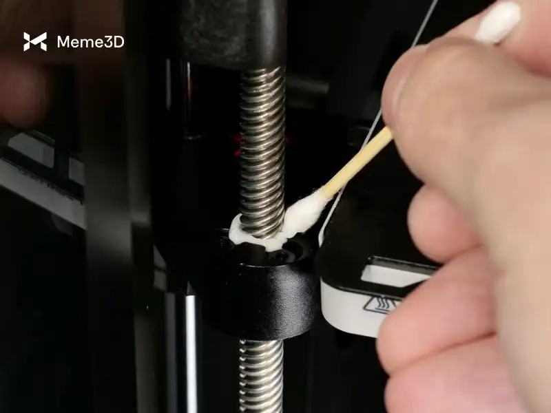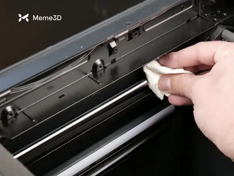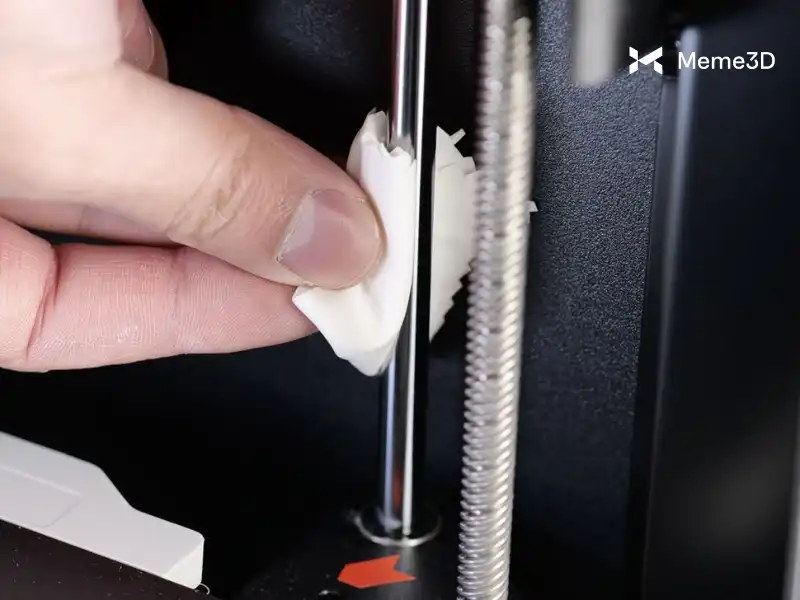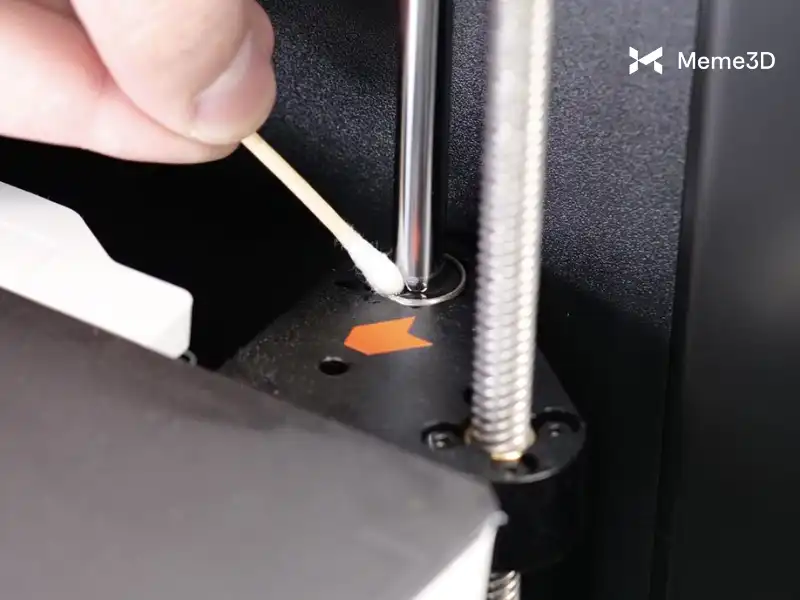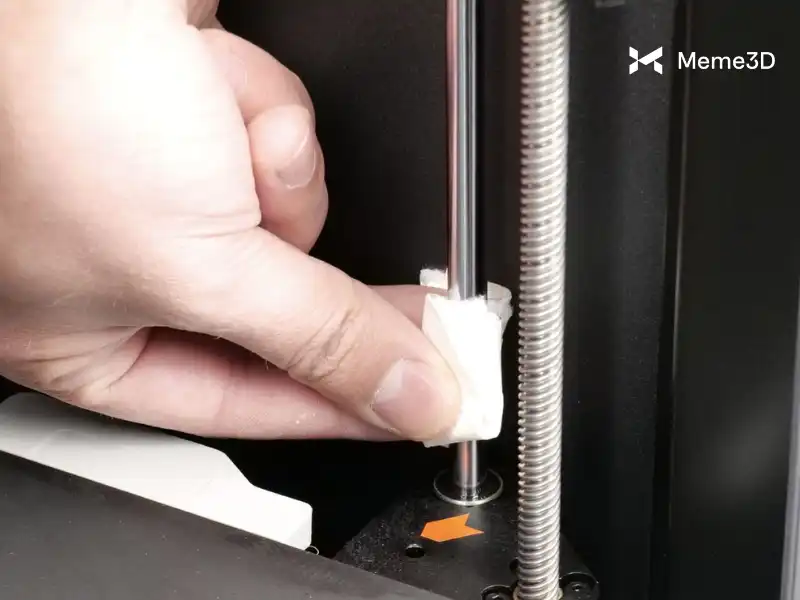 Chúng ta hãy bắt đầu với các thanh dẫn hướng tuyến tính. Giống như trục Y, các thanh dẫn hướng cần được làm sạch trước bằng khăn giấy sạch hoặc vải sợi nhỏ. Bắt đầu bằng cách hạ bàn nhiệt xuống vị trí thấp nhất, sau đó lau nhẹ nhàng để loại bỏ bụi bẩn hoặc chất gây ô nhiễm.