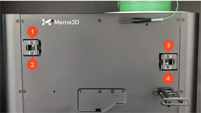 Bước đầu tiên trong việc vệ sinh các thanh carbon là nới lỏng bốn ốc vít ở phía sau giữ chặt bộ căng đai. Bước này rất quan trọng vì nó cho phép đầu in di chuyển dễ dàng hơn trong quá trình vệ sinh và giúp đảm bảo độ căng đai được điều chỉnh đều sau khi hoàn tất.