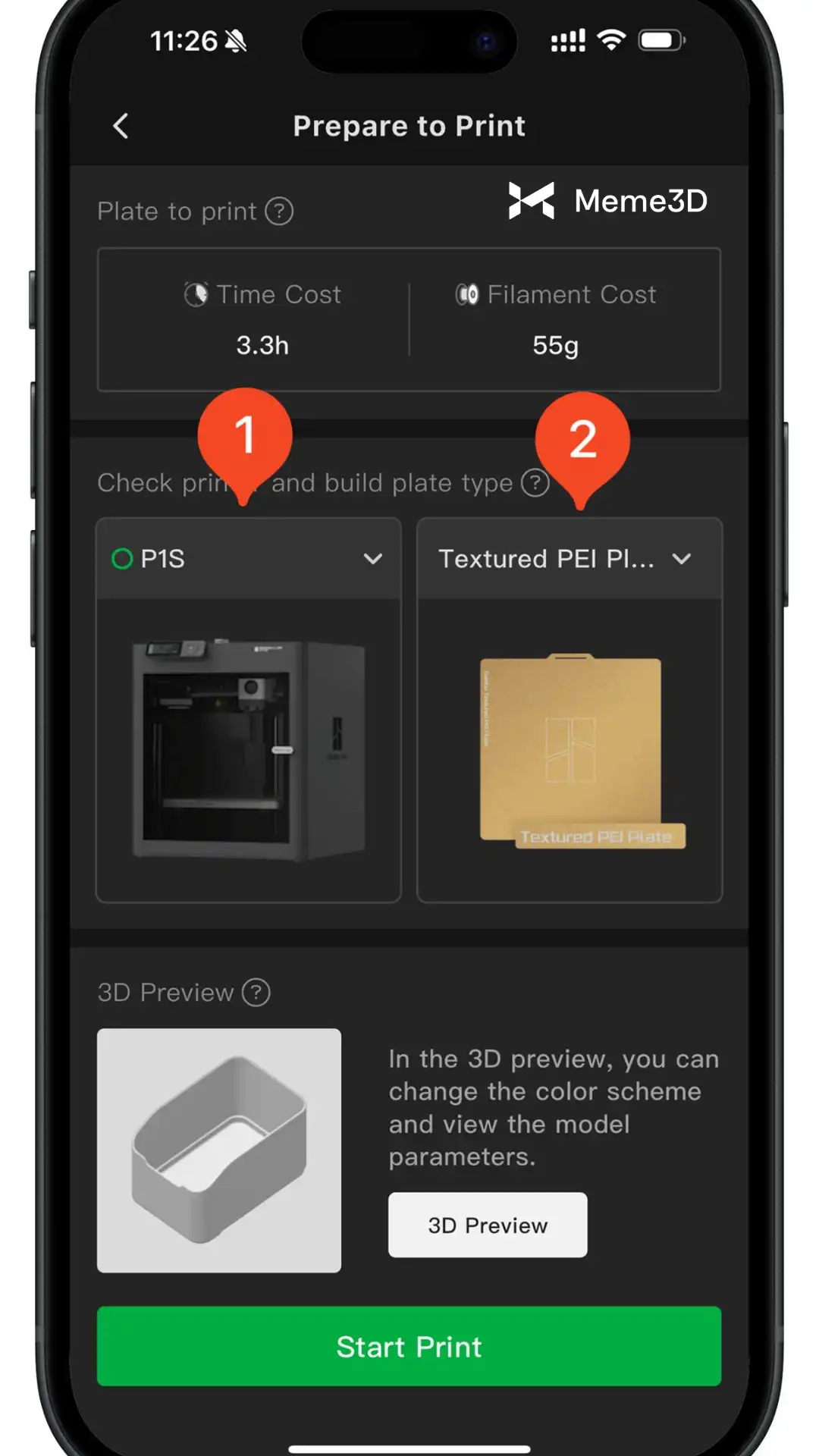Tiếp theo, bạn cần chọn kiểu máy in và loại bàn in được lắp đặt trên máy in của mình. Trong ví dụ này, hãy chọn P1S và Bàn in PEI có vân . Trước khi in, hãy đảm bảo bàn in của bạn sạch sẽ nếu cần và luôn sử dụng bàn in tương thích với loại sợi in bạn đã chọn để có kết quả tốt nhất.
