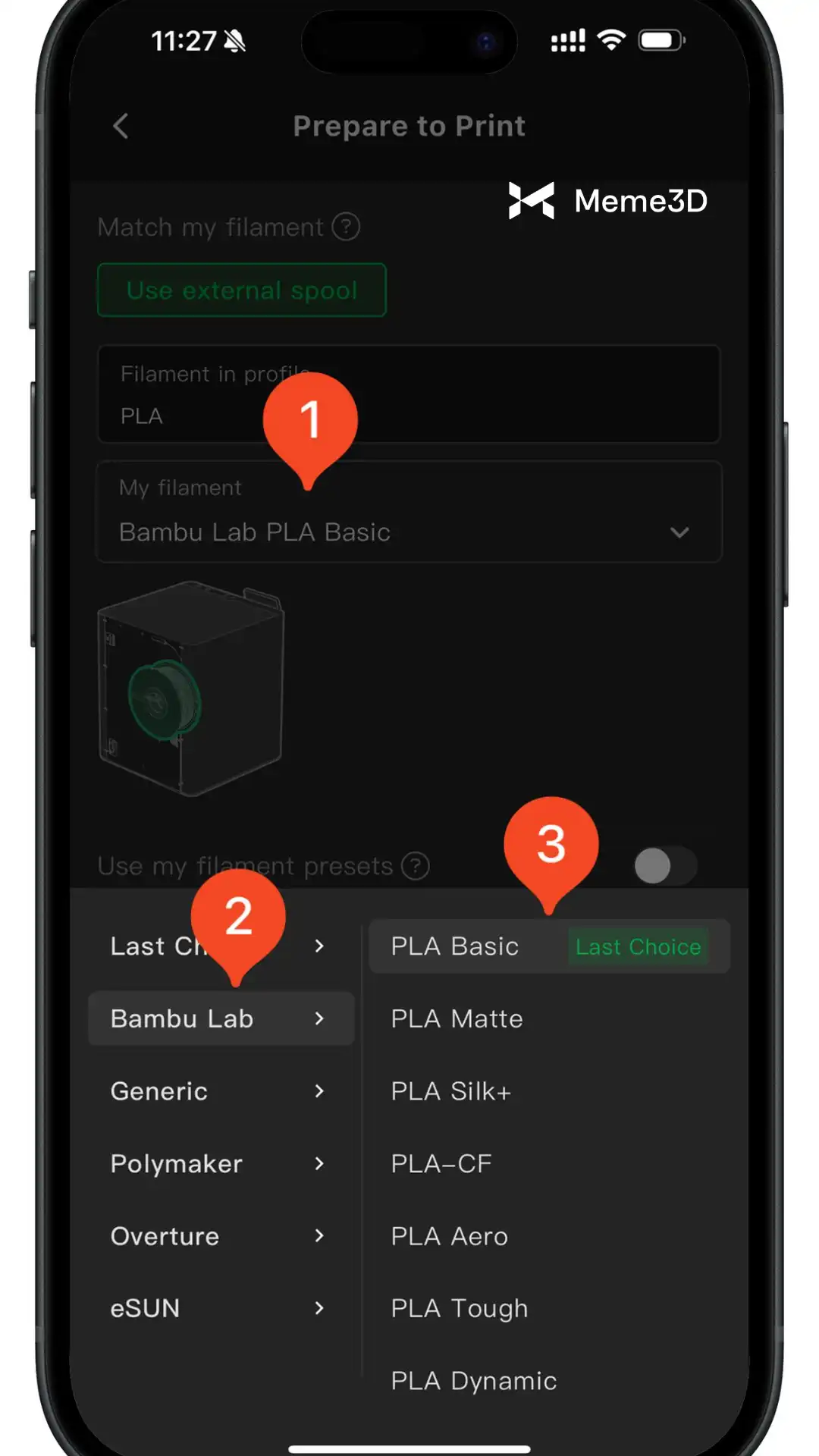 Mặc định, máy in sẽ sử dụng loại sợi in đã được nạp trước đó. Tuy nhiên, nếu bạn muốn chuyển sang loại sợi in khác, bạn có thể chọn nó trong phần tùy chọn bằng cách cuộn xuống. Trong ví dụ này, sợi in PLA cơ bản của Bambu Lab đã được sử dụng. Hãy đảm bảo rằng sợi in đã chọn tương thích với bàn in và cài đặt in của bạn để có kết quả tốt nhất.