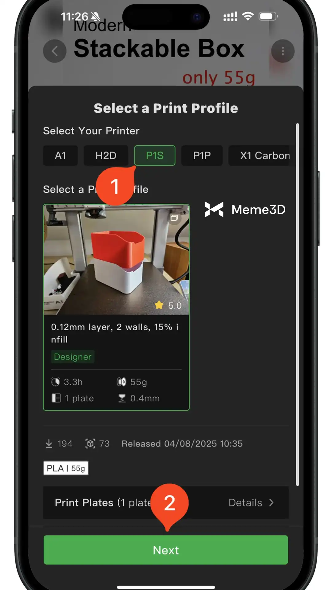 Một danh sách các cấu hình sẽ hiện ra. Chọn máy in của bạn ở phần trên cùng ( P1S trong ví dụ này) rồi nhấn Tiếp theo.