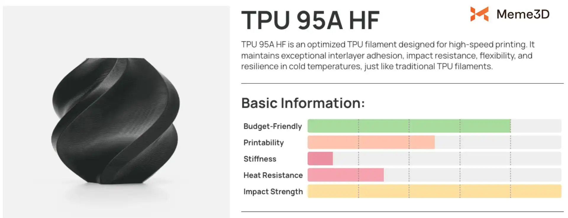 Sợi nhựa TPU (Polyurethane nhiệt dẻo) là một vật liệu mềm và dẻo được sử dụng rộng rãi để tạo ra các sản phẩm như ốp điện thoại, gioăng, vòng đệm và thiết bị đeo được nhờ độ đàn hồi và độ bền tuyệt vời. Mặc dù TPU có thể được in tương đối dễ dàng, nhưng nó có thể cần một số điều chỉnh nhỏ trong cài đặt in như giảm tốc độ in và độ rút sợi để tránh tắc nghẽn và đảm bảo quá trình đùn diễn ra trơn tru.