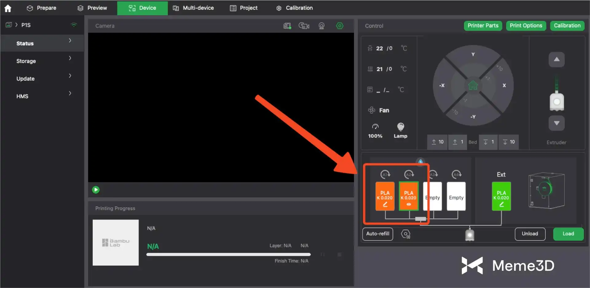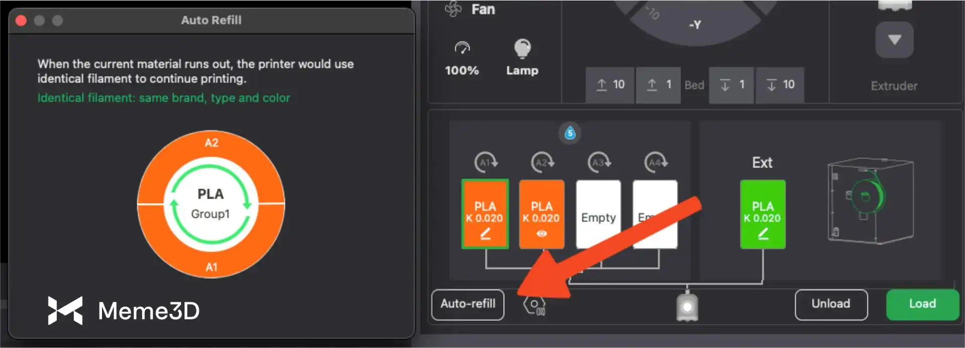 Để sử dụng tính năng này, trước tiên hãy nạp hai cuộn nhựa in giống hệt nhau vào AMS ở hai khe đầu tiên của thiết bị.