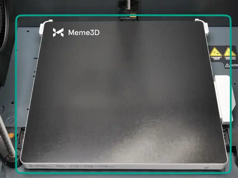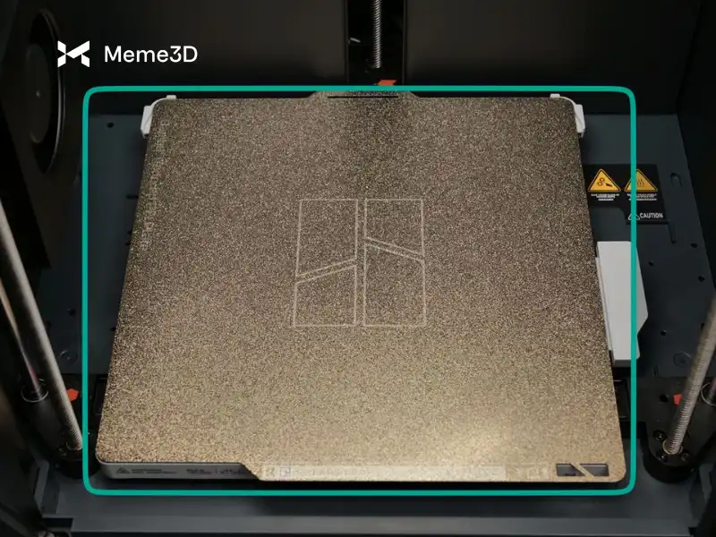 Máy in 3D P1S đi kèm với một tấm PEI có vân màu vàng , được gắn từ tính vào bàn nhiệt và đóng vai trò là bề mặt in chính . Tấm in linh hoạt này giúp tăng cường độ bám dính khi in đồng thời giúp việc tháo mô hình dễ dàng hơn—chỉ cần uốn cong nhẹ tấm in là các vật thể đã in có thể dễ dàng tách ra.