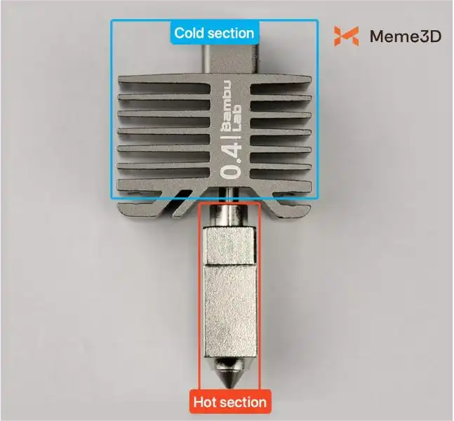- Phần đầu lạnh chứa một bộ tản nhiệt để giữ cho sợi nhựa luôn mát cho đến khi nó đi vào phần đầu nóng, và nó được làm mát bởi một quạt nhỏ ở bên trái của phần đầu nóng.