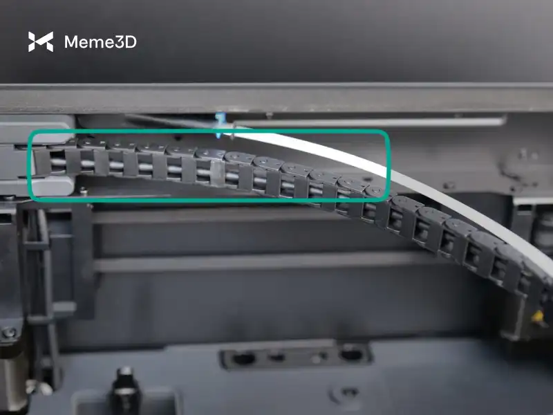 Dây xích dẫn cáp được làm từ nhựa và được thiết kế để đỡ và sắp xếp dây cáp chạy đến đầu phun . Điều này đảm bảo dây cáp luôn chắc chắn và được bảo vệ khỏi hư hỏng trong quá trình di chuyển của máy in. Gắn vào dây dẫn cáp là ống PTFE màu trắng , giúp dẫn sợi nhựa từ cuộn dây đến bộ đùn, đảm bảo việc cấp sợi nhựa diễn ra trơn tru và hiệu quả mà không bị rối hoặc tắc nghẽn.