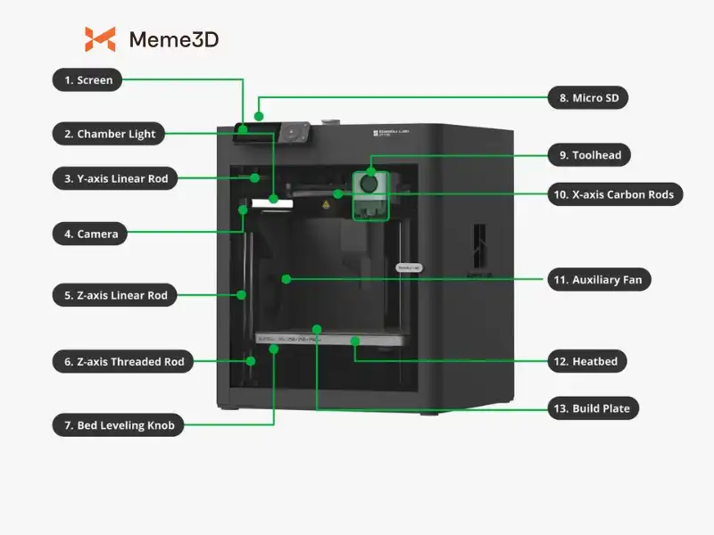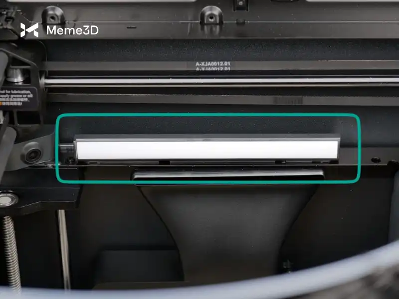 Thanh đèn LED trong buồng in nằm ở phía bên trái của buồng in. Mục đích chính của nó là chiếu sáng mô hình in 3D, đảm bảo khả năng quan sát tốt hơn. Điều này đặc biệt hữu ích cho camera quan sát trực tiếp , cho phép nó hoạt động hiệu quả trong điều kiện thiếu sáng. Ngoài ra, đèn LED giúp bạn nhìn rõ hơn bên trong buồng in tối, giúp dễ dàng theo dõi quá trình in.