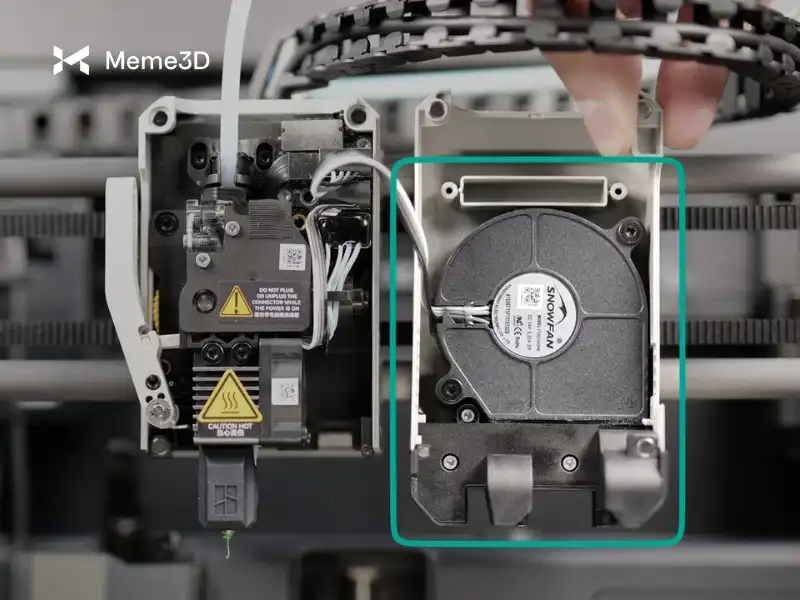 Quạt làm mát bản in giúp làm mát nhanh chóng từng lớp in, cải thiện chất lượng in. Quạt được gắn ở phía trước đầu in và được gắn bằng nam châm để dễ dàng tháo lắp. Quạt này có thể hoạt động cùng với quạt phụ để tăng cường khả năng làm mát, hoặc có thể được sử dụng riêng biệt – đặc biệt khi in các vật liệu không cần luồng khí mạnh.