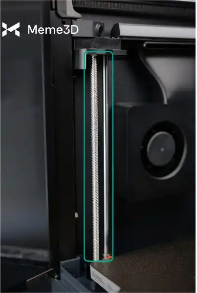 Máy in 3D P1S di chuyển bàn nhiệt dọc theo trục Z bằng ba thanh ren được định vị chính xác, còn được gọi là vít me (như hình bên trái): một thanh ở phía trước bên trái, một thanh ở phía trước bên phải và một thanh ở giữa phía sau bàn nhiệt. Các vít me này hoạt động đồng bộ, được dẫn động bởi động cơ trục Z nằm ở phía dưới máy in .
