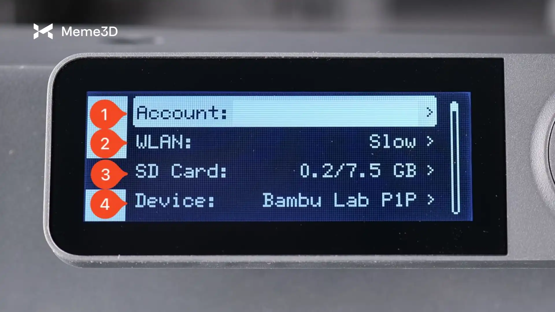 - Thẻ SD – Mở một menu phụ cho phép bạn xem chi tiết thẻ Micro SD, định dạng và tháo thẻ an toàn khi máy in đang hoạt động. Luôn sử dụng nút Tháo thẻ trước khi lấy thẻ ra để tránh làm hỏng dữ liệu.