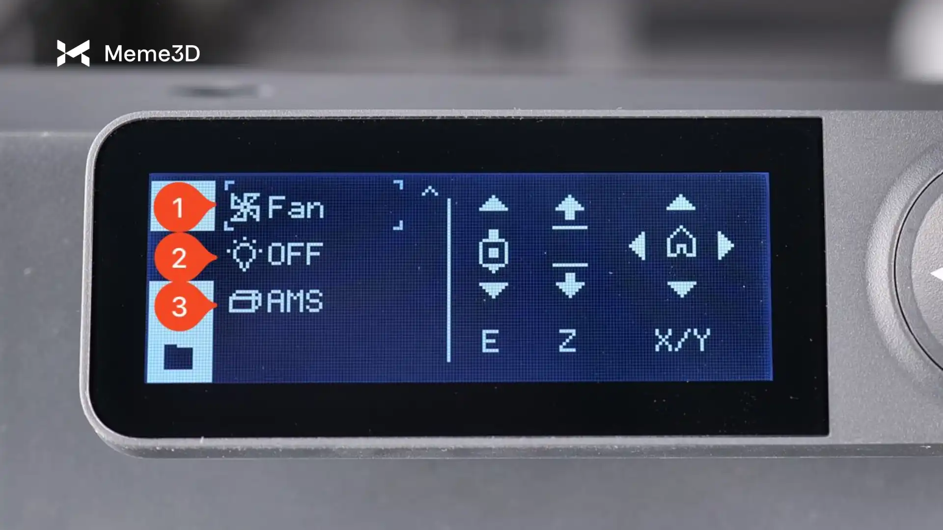 - Phím mũi tên xuống – Hiển thị thêm 3 tùy chọn liên quan đến Quạt, Đèn và AMS.
