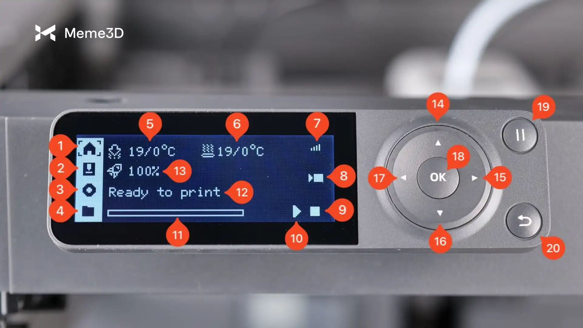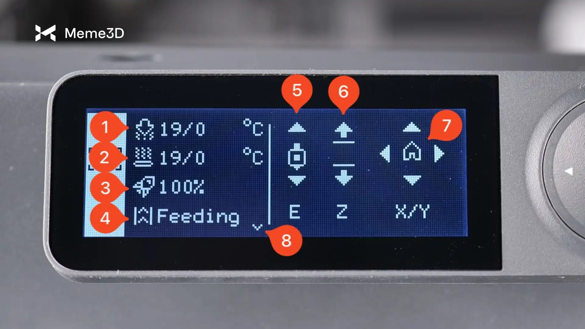 - Menu Trang chủ – Quay lại màn hình chính, cung cấp quyền truy cập vào các chức năng chính như thay đổi nhiệt độ đầu phun và bàn nhiệt, tốc độ in và các tương tác khác.