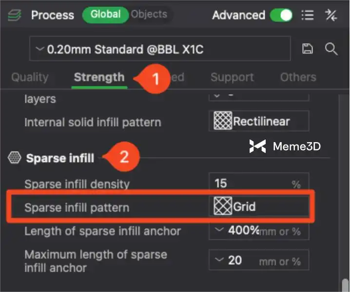 Tùy chọn Sparse Infill (nằm trong tab Strength) đại diện cho cấu trúc bên trong dùng để lấp đầy không gian bên trong của một chi tiết in, giúp tạo khung đỡ và tăng độ bền mà không cần phải đúc đặc toàn bộ chi tiết đó.