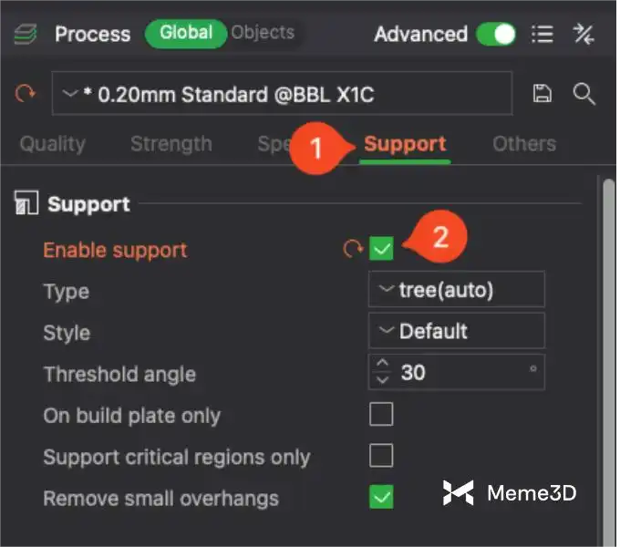 Khi bật tính năng này, Bambu Studio sẽ phát hiện tất cả các phần nhô ra của mô hình và tạo giá đỡ cho chúng.