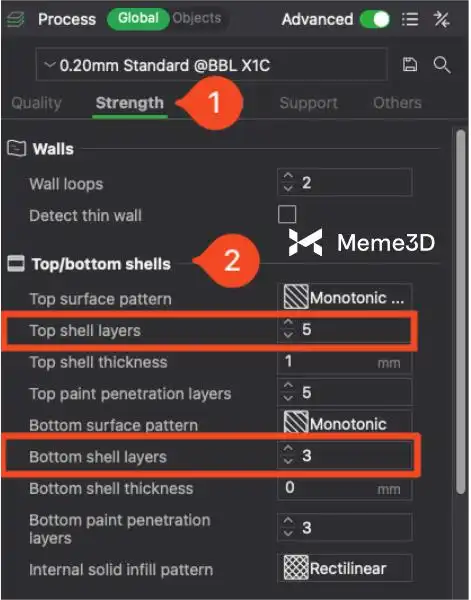 Khi quyết định số lượng lớp vỏ trên và dưới, nên sử dụng độ dày gần bằng hoặc tương tự với độ dày của các vòng tường. Ví dụ, nếu bạn in với 3 vòng tường có tổng độ dày khoảng ~1,2mm, thì số lượng lớp trên và dưới nên được đặt ở mức ~6, tổng cộng khoảng ~1,2mm, in ở độ cao lớp 0,2mm.